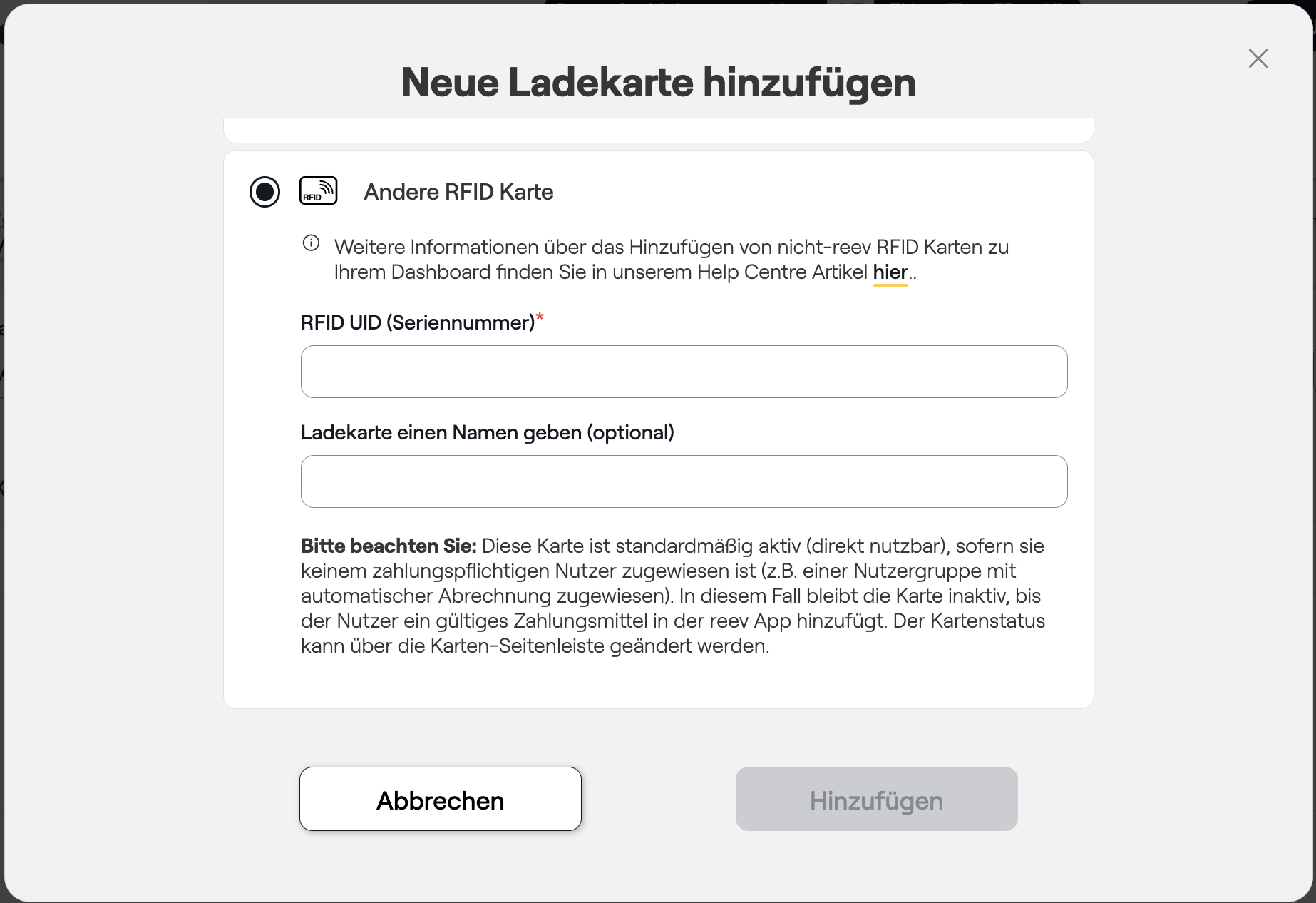 Öffnen Sie in Ihrem reev Dashboard den Menüpunkt Nutzer, Unterpunkt Ladekarten und klicken Sie rechts oben auf neue Ladekarte hinzufügen. Wählen Sie anschließend im sich öffnenden Fenster den Reiter Andere RFID Karte aus.