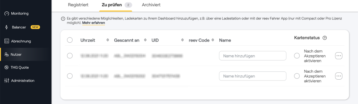 Wenn Ihre Ladekarte die technischen Standards erfüllt, erscheint diese nun in Ihrem reev Dashboard im Menüpunkt Nutzer, Unterpunkt Ladekarten und dann oben im Reiter zu prüfen. Hier können Sie die Ladekarte noch benennen und anschließend zu Ihrem reev Dashboard hinzufügen.