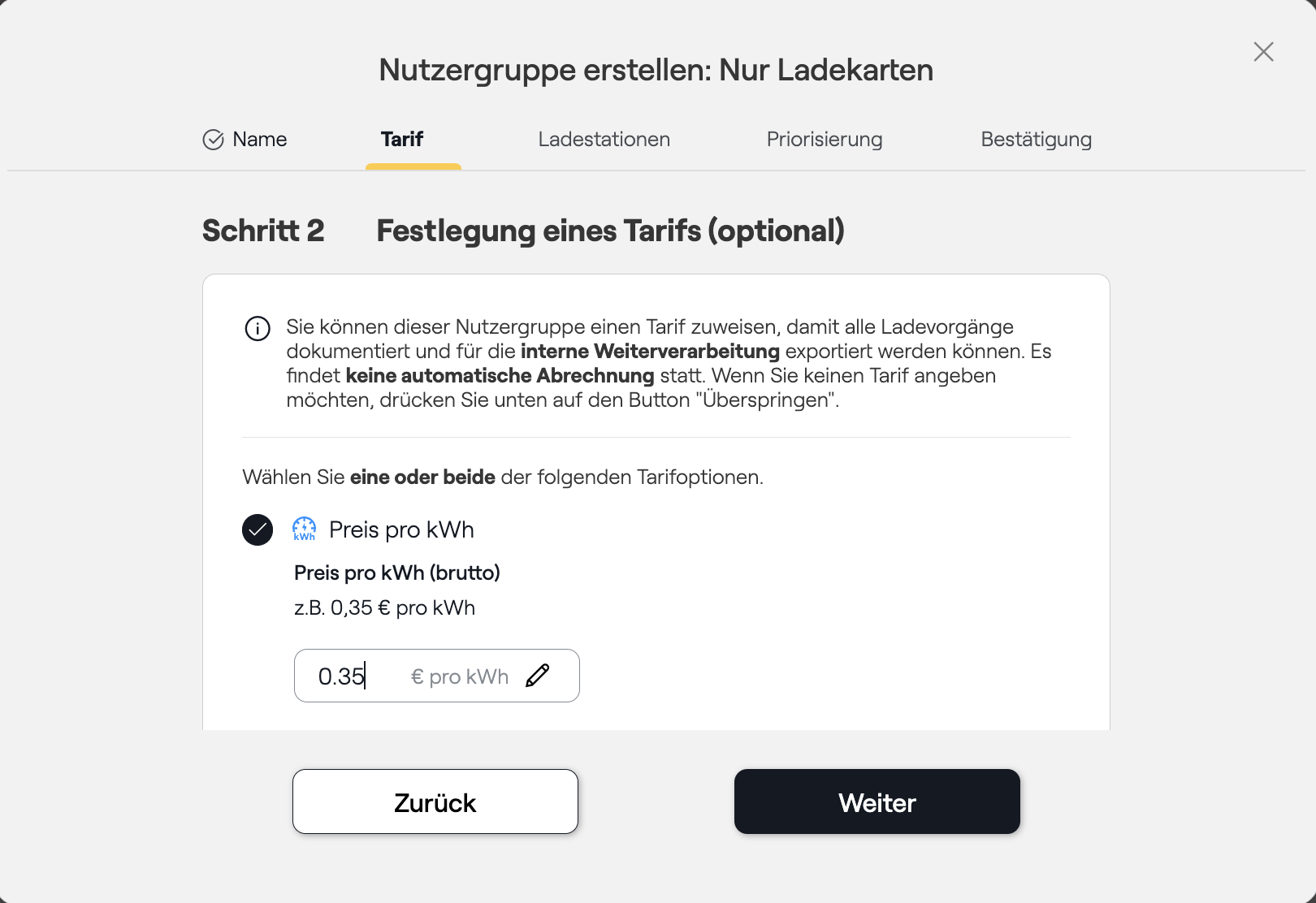 - Schritt 2 ist optional: Sie können einen Tarif festlegen, mit Hilfe dessen alle Ladevorgänge, die über diese Nutzergruppe getätigt werden, in Ihrem reev Dashboard dokumentiert werden. Dies kann für eine interne Weiterverarbeitung der Ladevorgänge hilfreich sein.