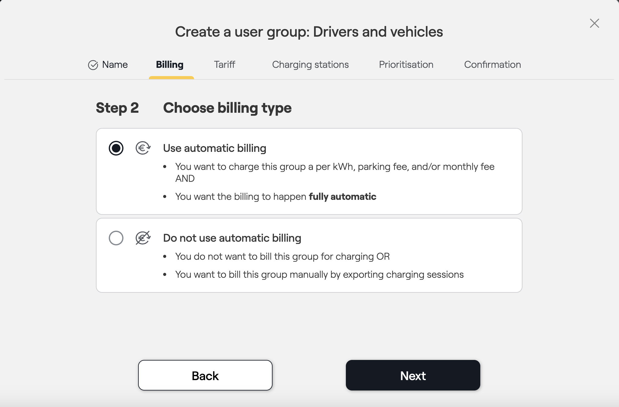 - Step 2: Decide whether the user group should be automatically billed or not.
