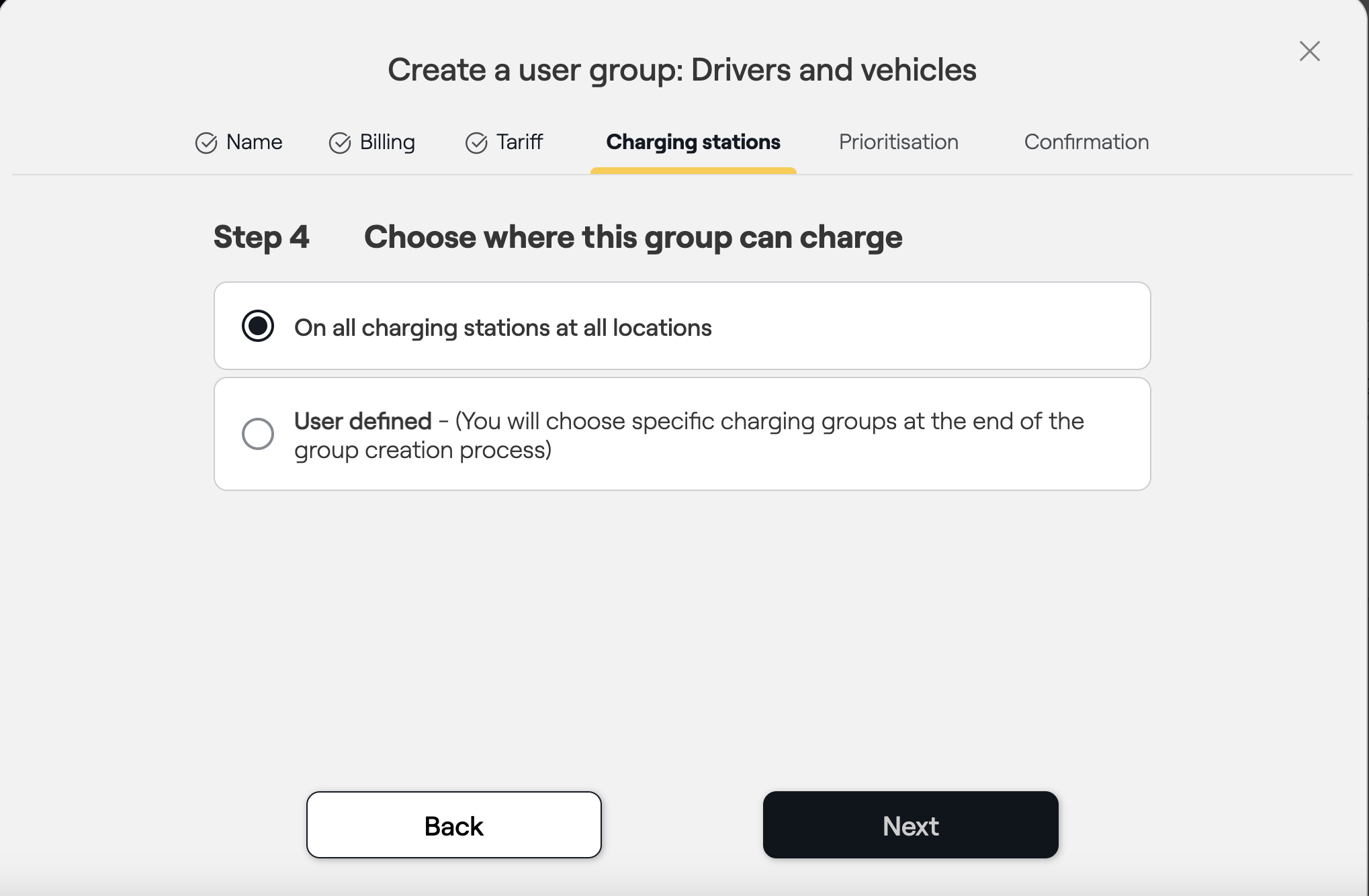 - Step 4: Determine whether the user group should be activated for the entire charging infrastructure or not.