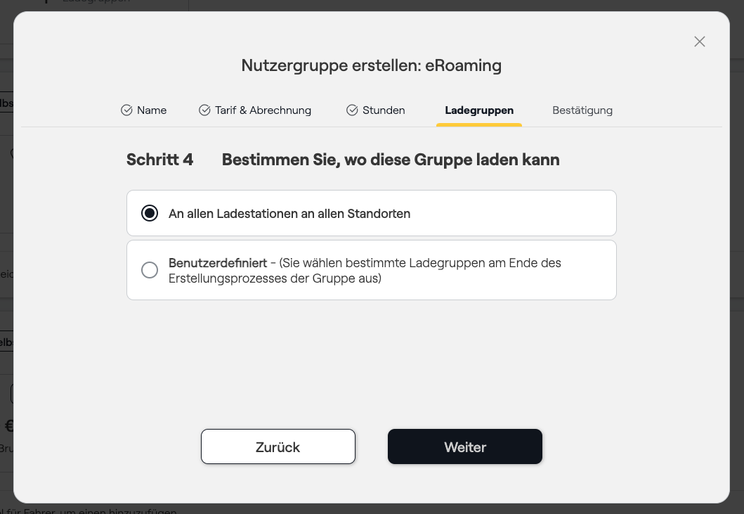 - Step 5: Decide whether the user group should be activated for the entire charging infrastructure (this can be adjusted later).