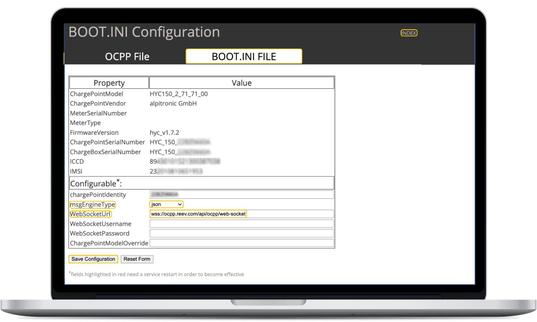 Select the menu item „OCPP Configuration“ and afterwards the subitem „Boot.Ini.File“. Insert the required data and select „Save Configuration“.