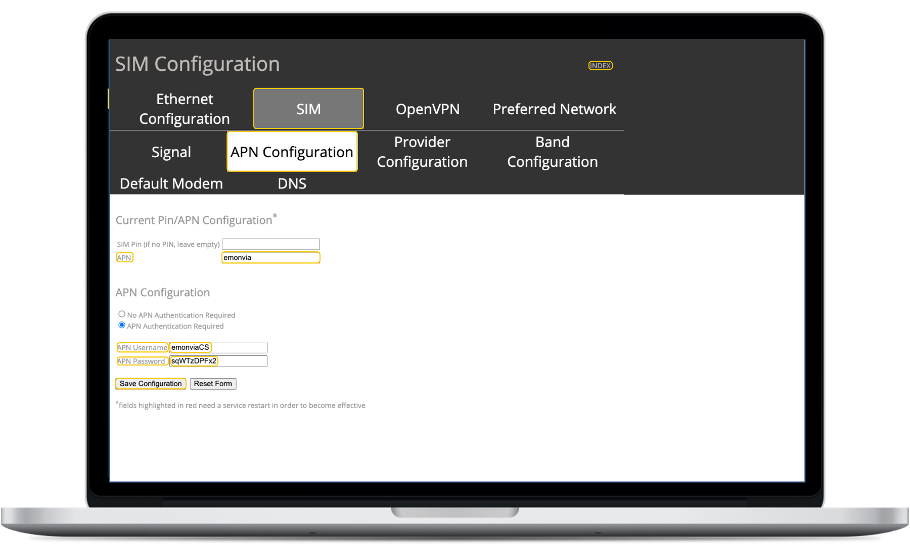 Select the menu item „SIM“, afterwards the subitem „APN Configuration“. Set the following values:
