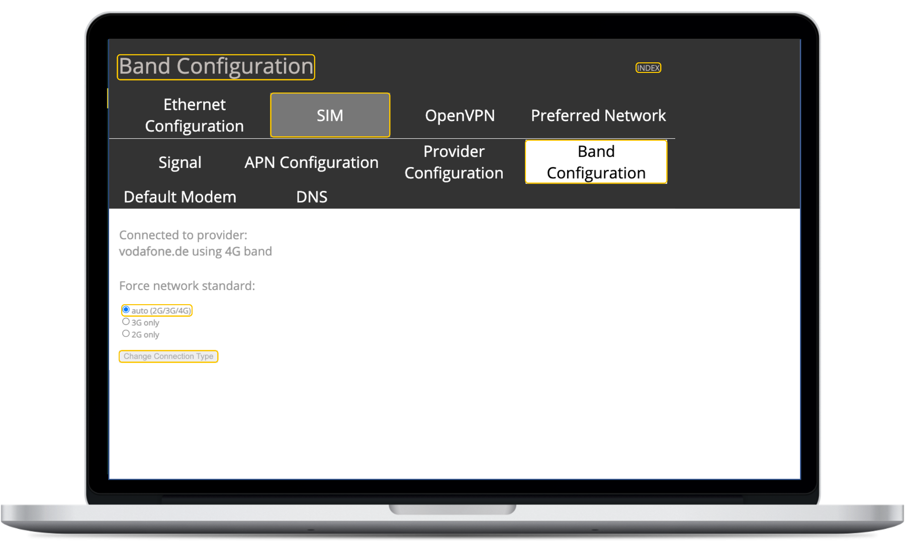 - Select "auto (2G/3G/4G)" in the subitem "Force Network Standard" and choose "Change Connection Type".