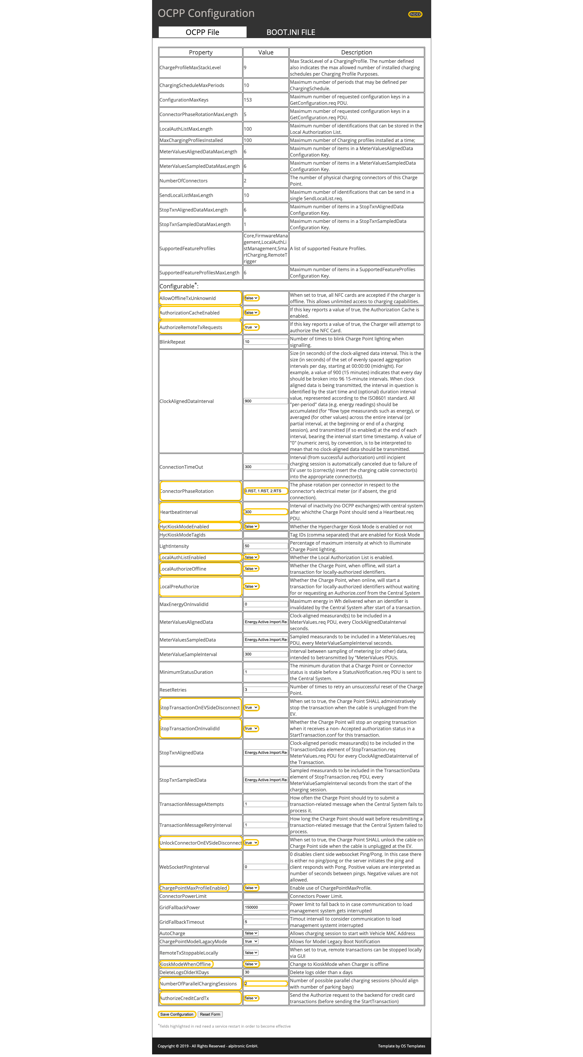 Select the subitem „OCPP File“. Set the parameters with the corresponding values in the categories marked in yellow. All the remaining configurations can be marked individually (Please note that not all subitems are configurable).