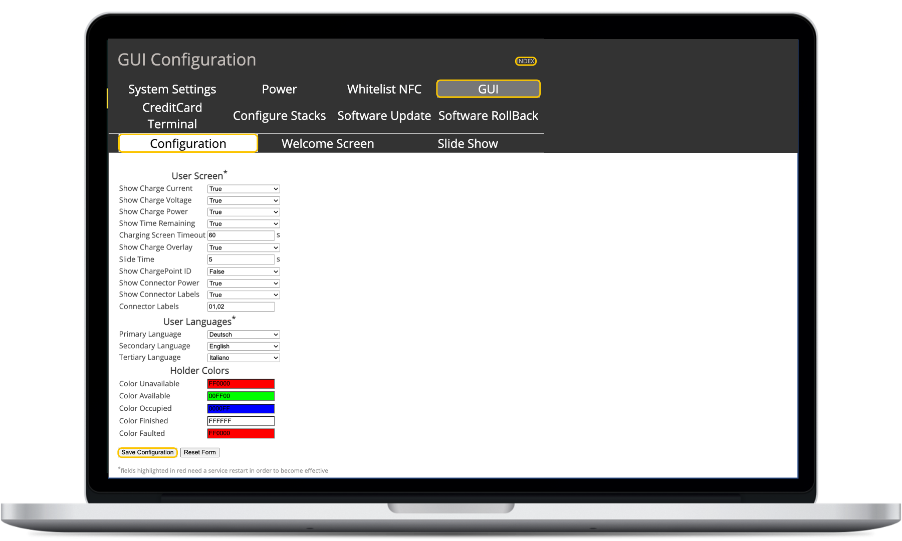 - The menu item "General Settings" > subitem "GUI" enables you to set preferred languages, colours and the physically displayed images on the Alpitronic screen.