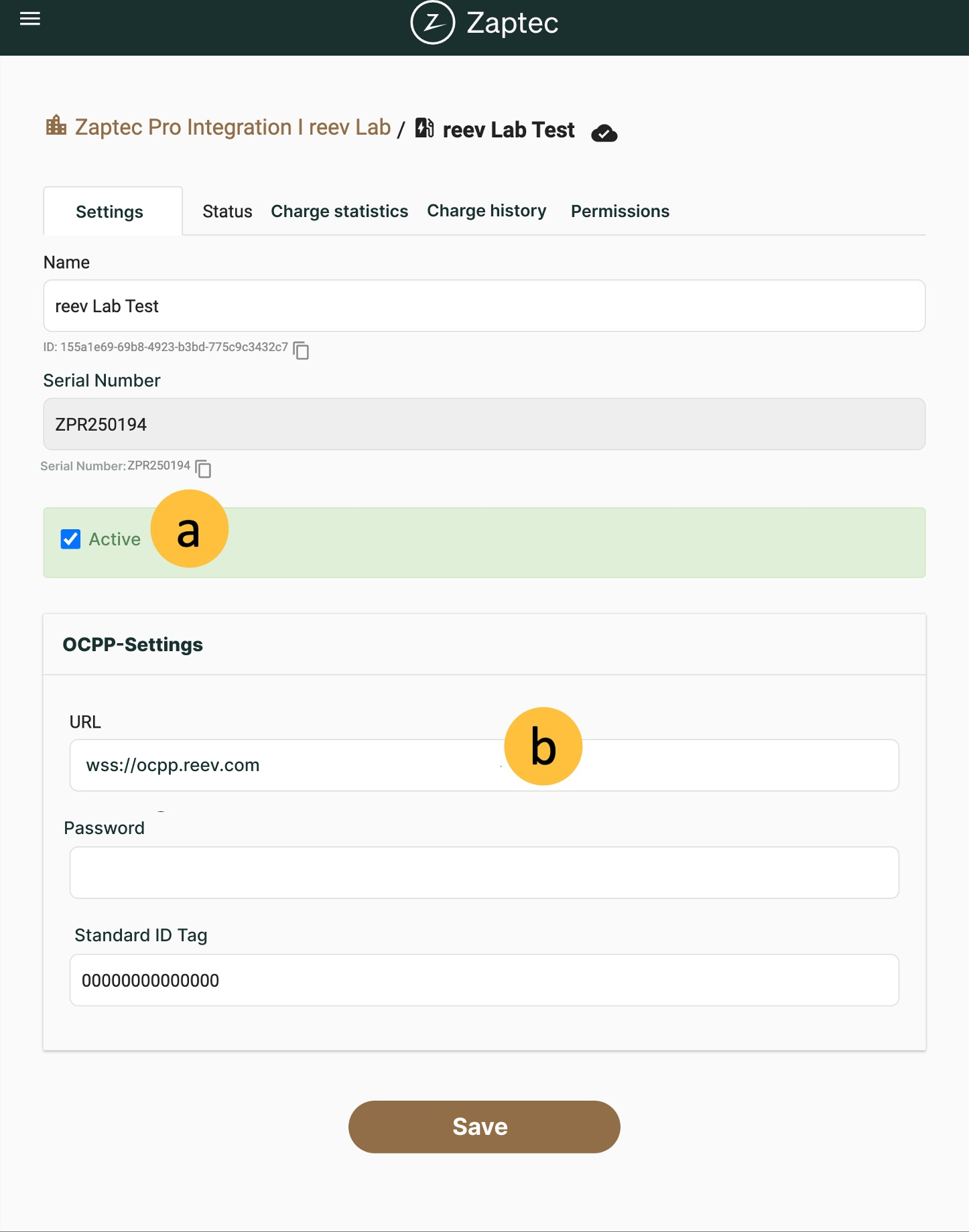 - Change the URL under "OCPP settings" to: wss://ocpp.reev.com