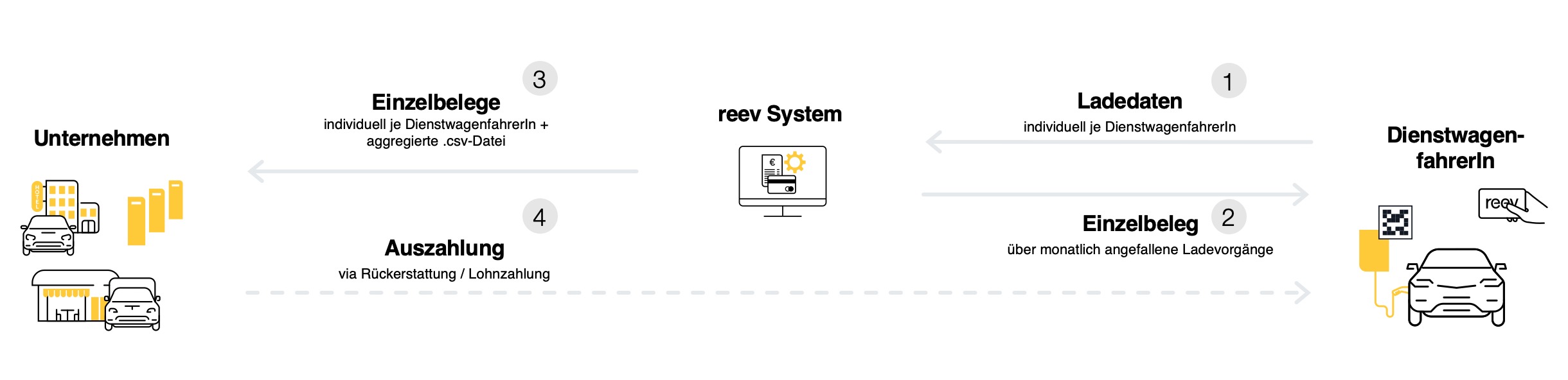 - Step 1: In the reev backend, business-related charging sessions, along with the reimbursement totals for each driver, are tracked and accumulated over the course of the month.