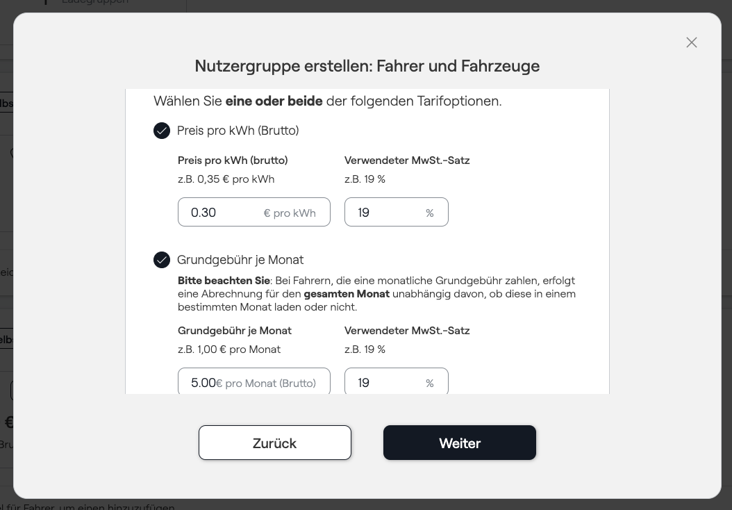 - Zonder automatische facturering (optioneel): U kunt een tarief instellen waarmee alle oplaadtransacties die via deze gebruikersgroep worden gedaan, worden gedocumenteerd in uw reev-dashboard. Dit kan behulpzaam zijn voor de interne en verdere verwerking van de laadprocessen.